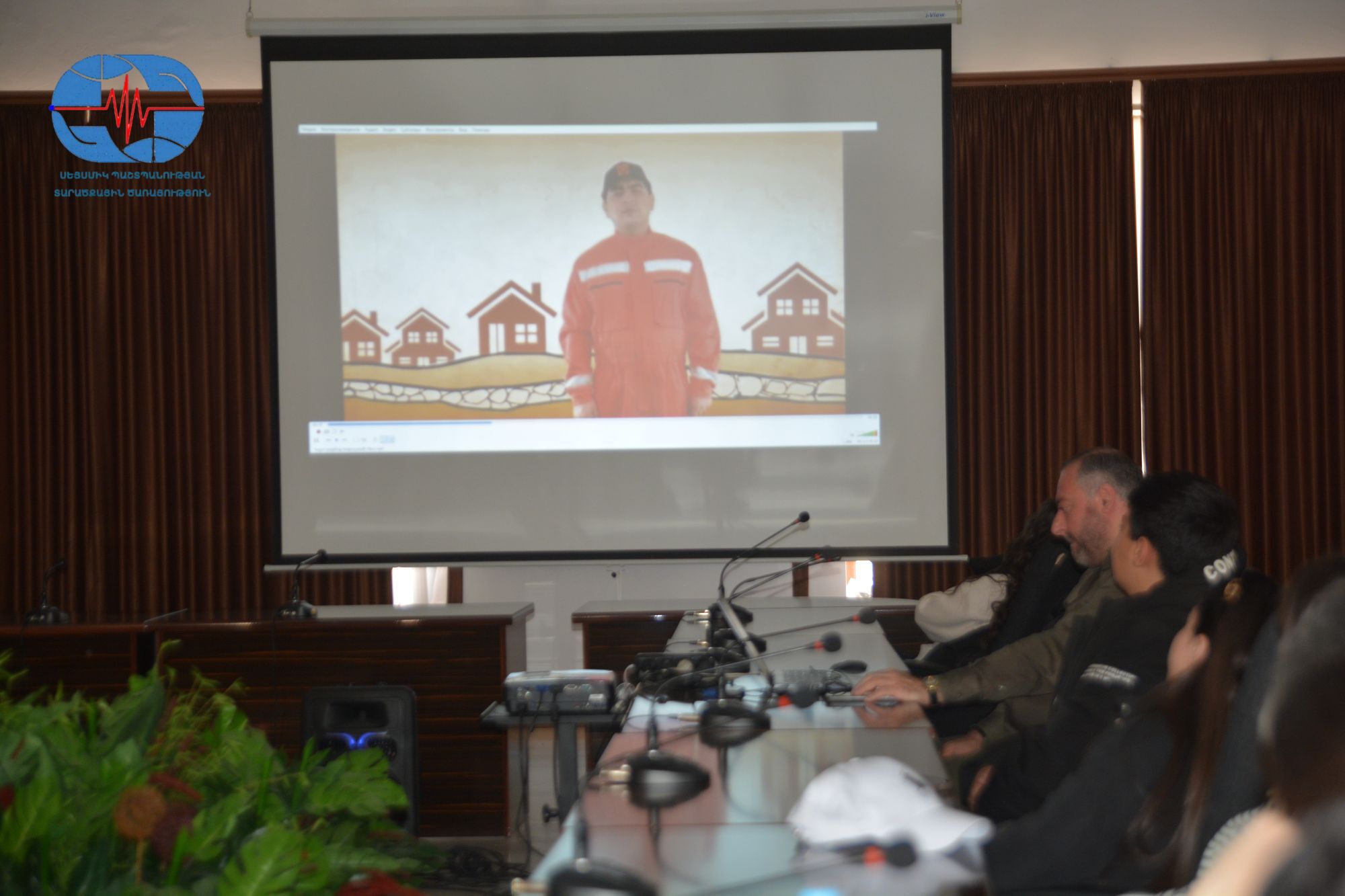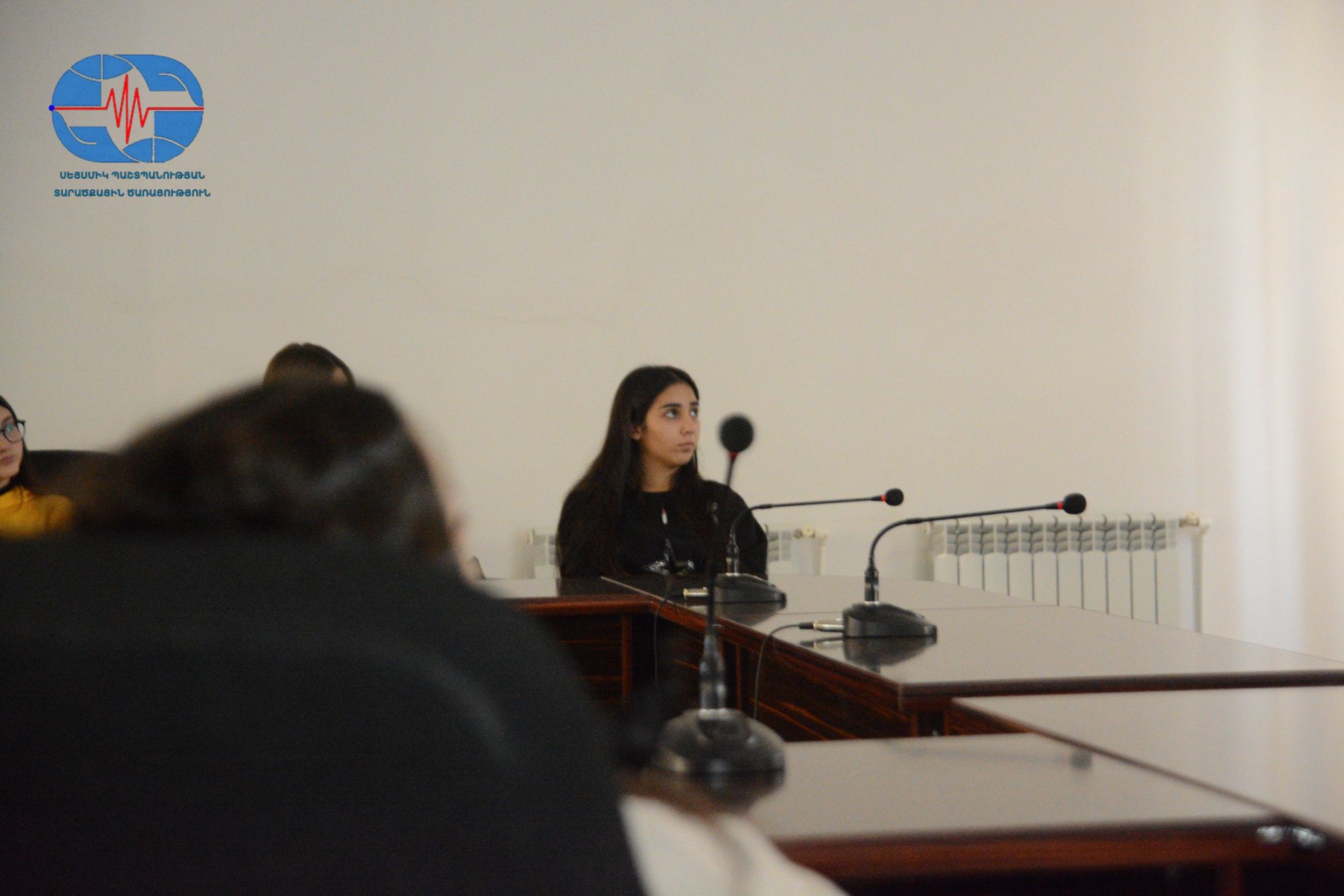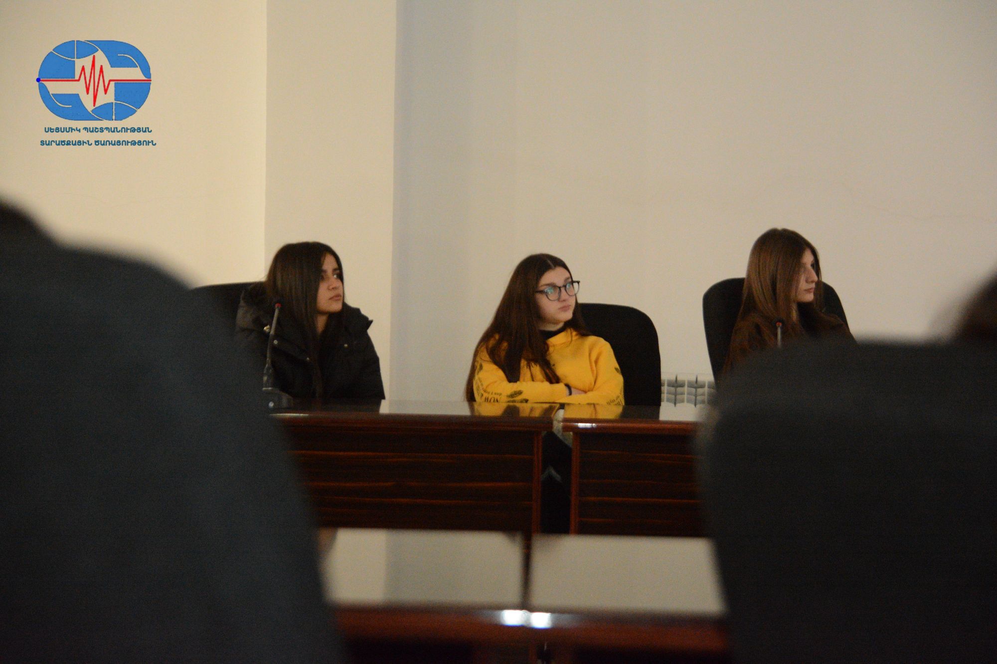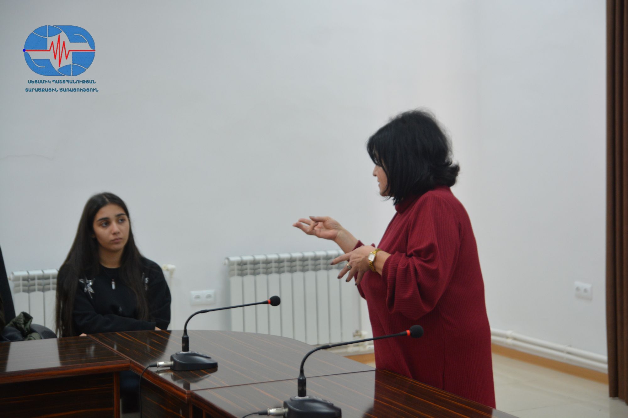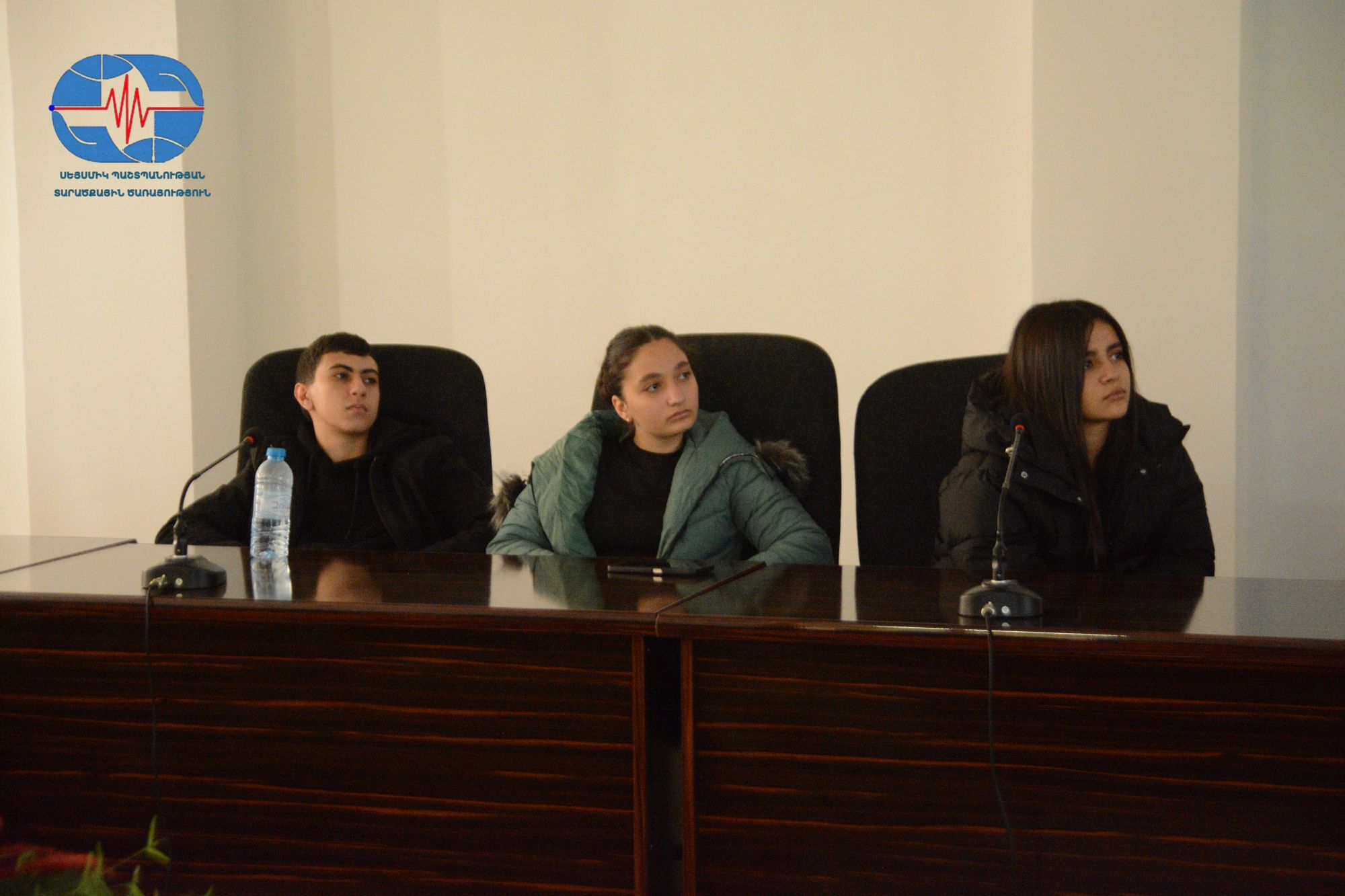 Բնակչության հետ տարվող աշխատանքների վարչության գլխավոր մասնագետ Հայկանուշ Եսայանը ներկայացրեց մեր տարածաշրջանում երկրաշարժերի առաջացման պատճառները, երկրաշարժից պաշտպանվելու վերաբերյալ գիտելիքի կարևորությունը, Սպիտակի երկրաշարժից քաղված դասերը և սեյսմակայուն շինարարության ոլորտում արված փոփոխությունները։ Ցուցադրվեց «Հաշտ ապրել երկրաշարժի հետ» ուսուցողական ֆիլմը։