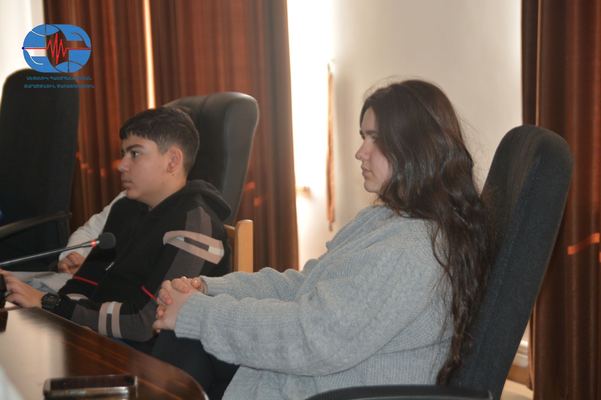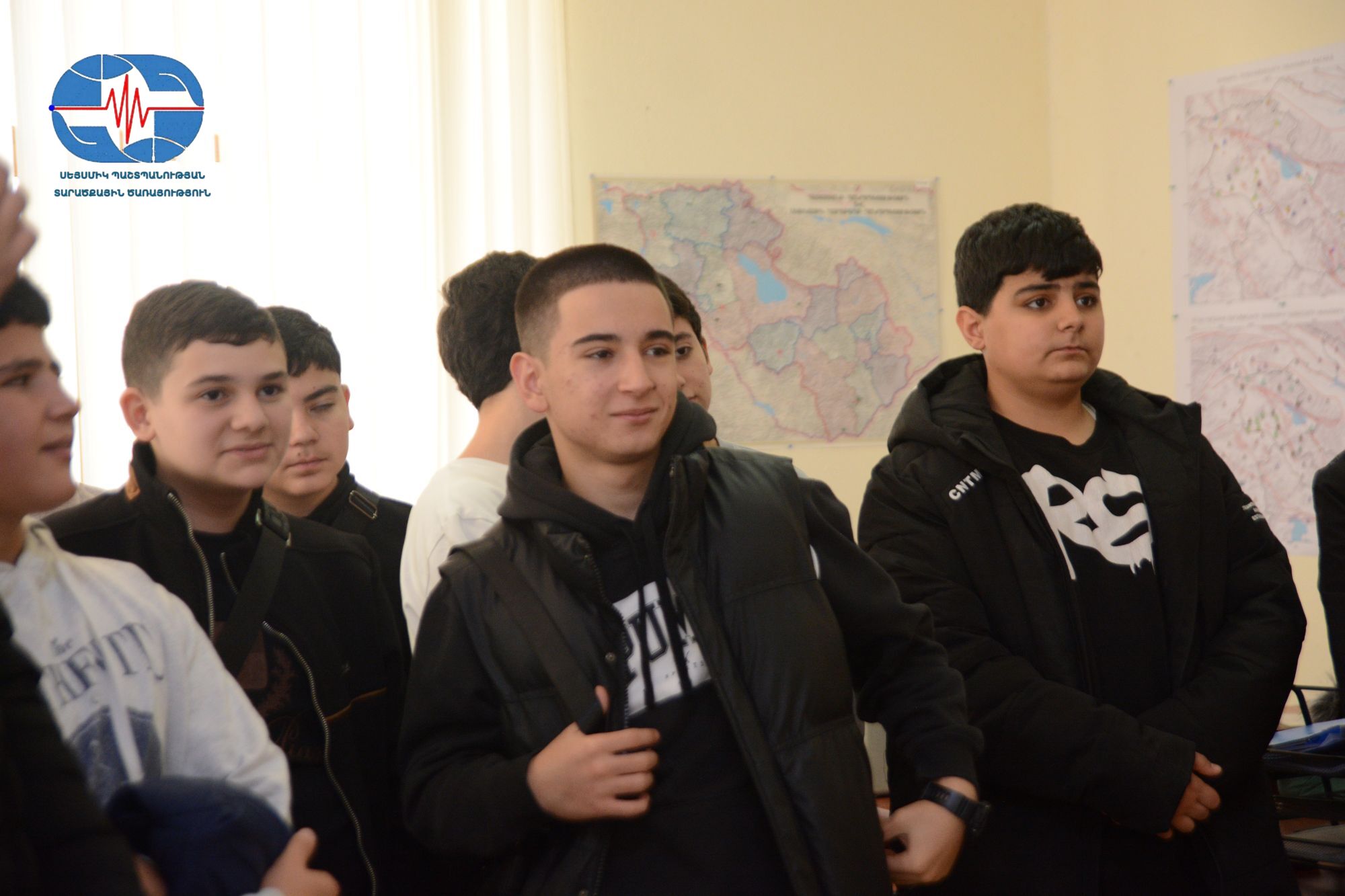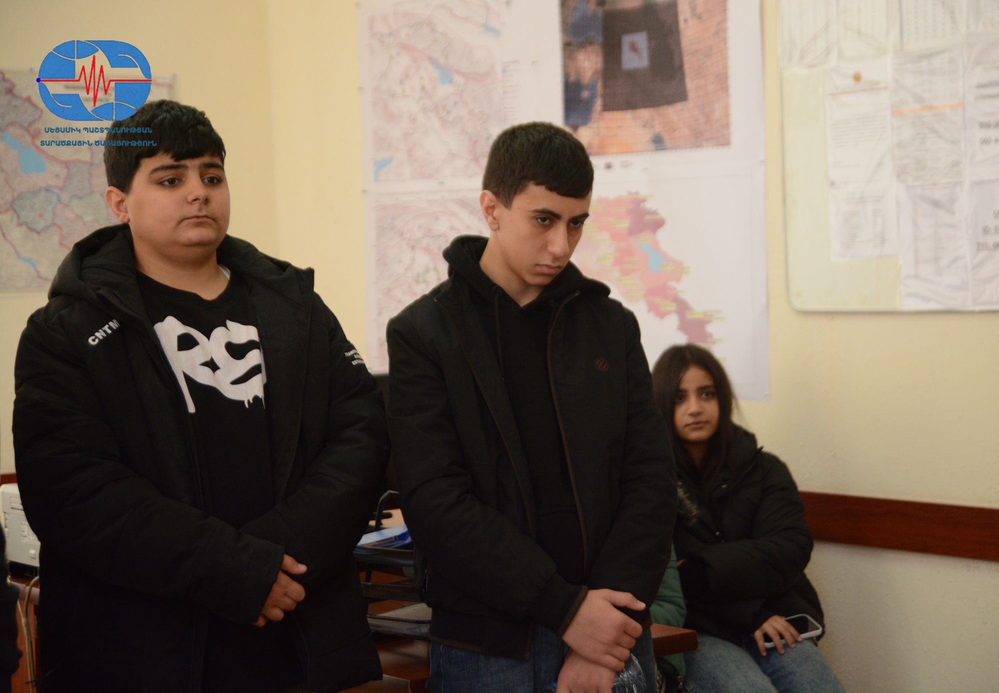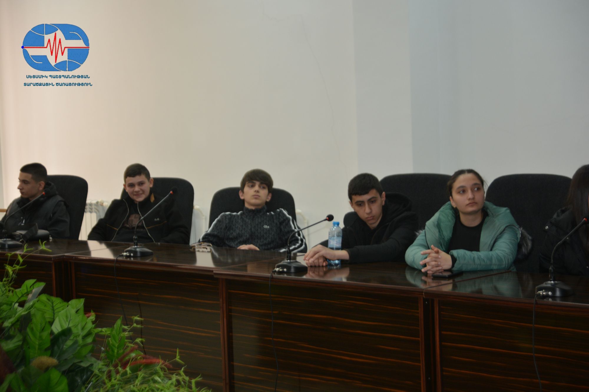Բնակչության հետ տարվող աշխատանքների վարչության գլխավոր մասնագետ Հայկանուշ Եսայանը ներկայացրեց մեր տարածաշրջանում երկրաշարժերի առաջացման պատճառները, երկրաշարժից պաշտպանվելու վերաբերյալ գիտելիքի կարևորությունը, Սպիտակի երկրաշարժից քաղված դասերը և սեյսմակայուն շինարարության ոլորտում արված փոփոխությունները։ Ցուցադրվեց «Հաշտ ապրել երկրաշարժի հետ» ուսուցողական ֆիլմը։