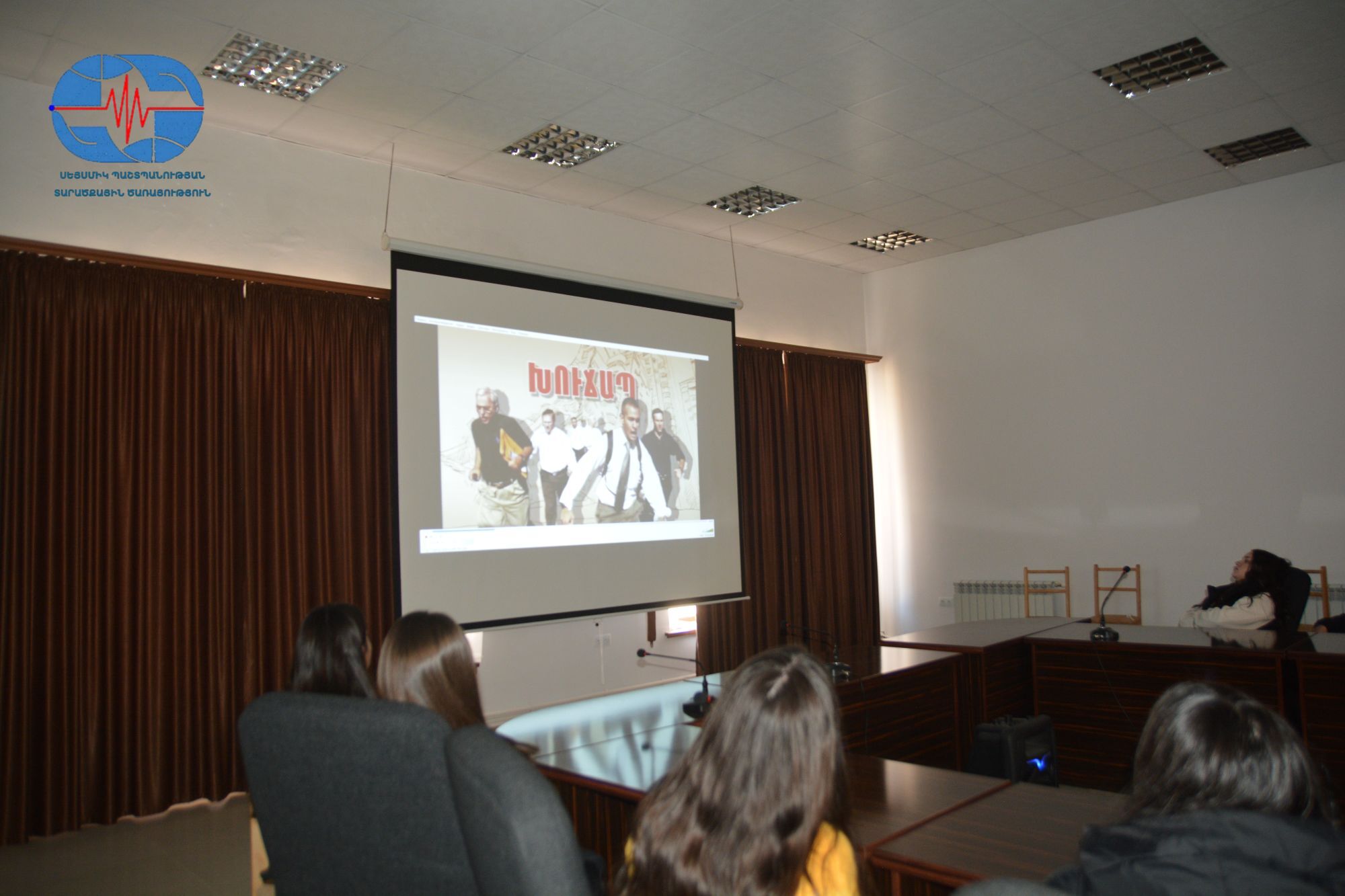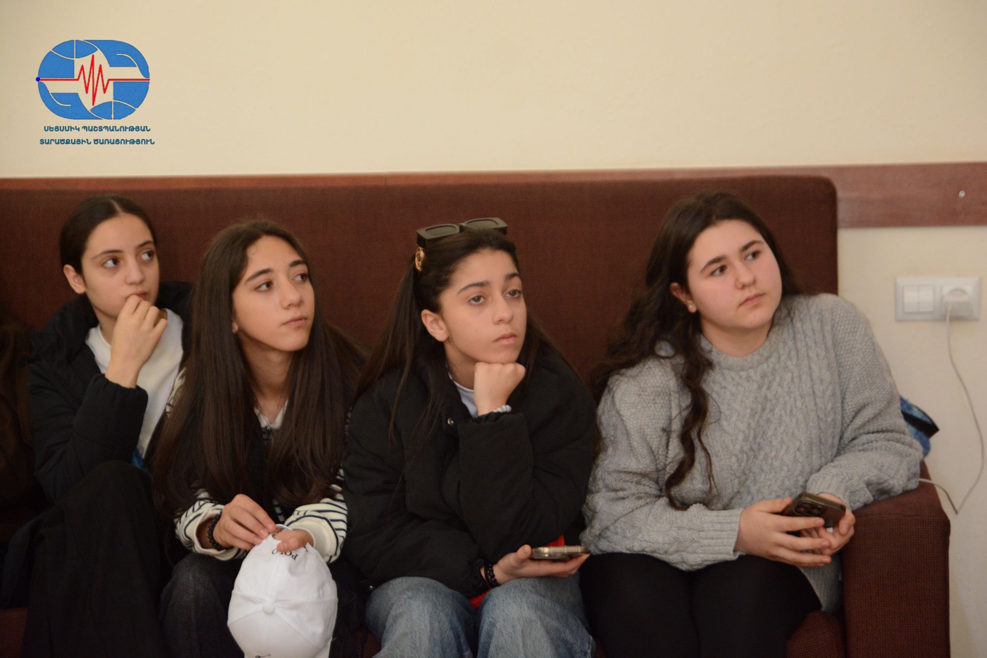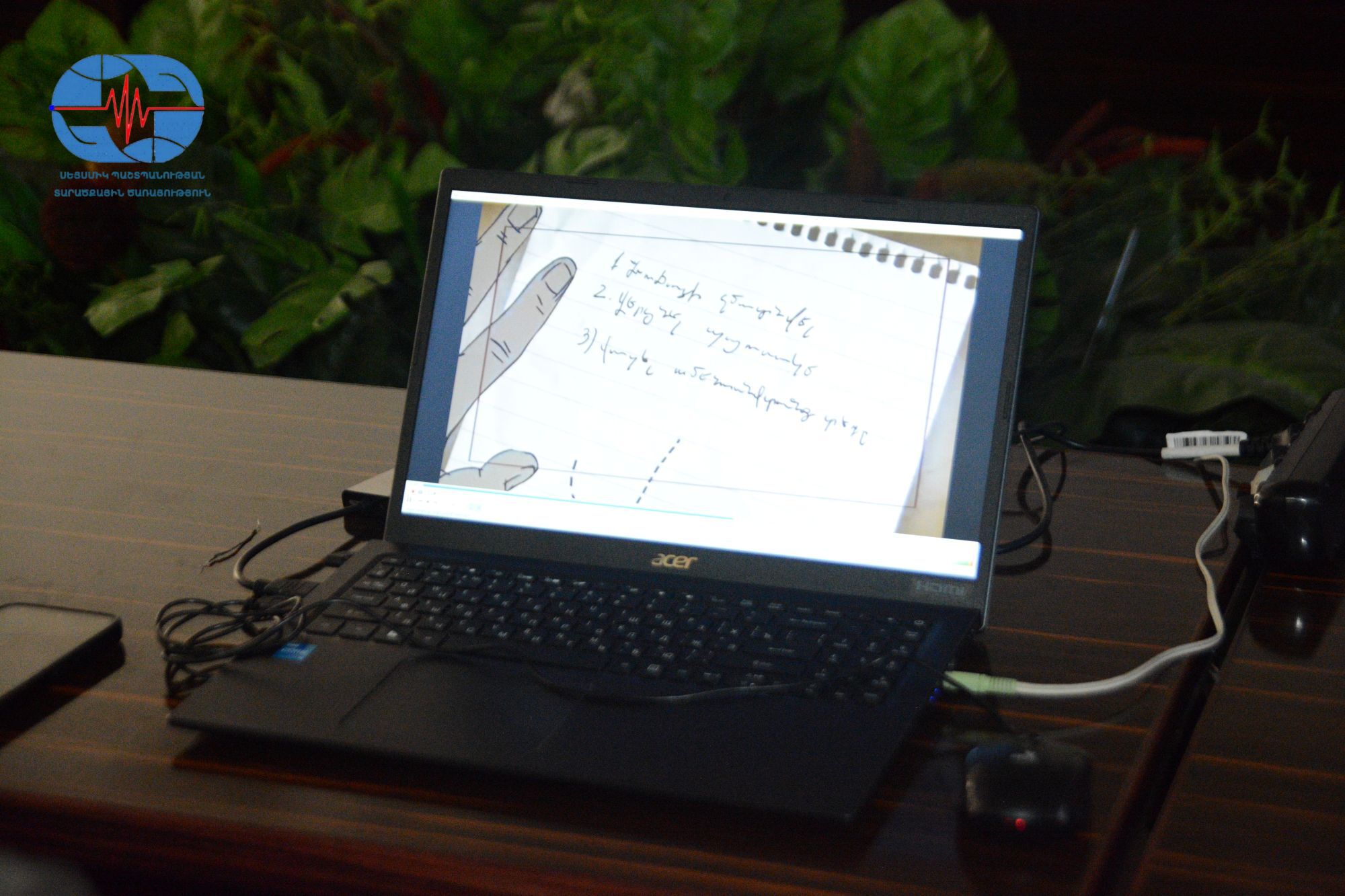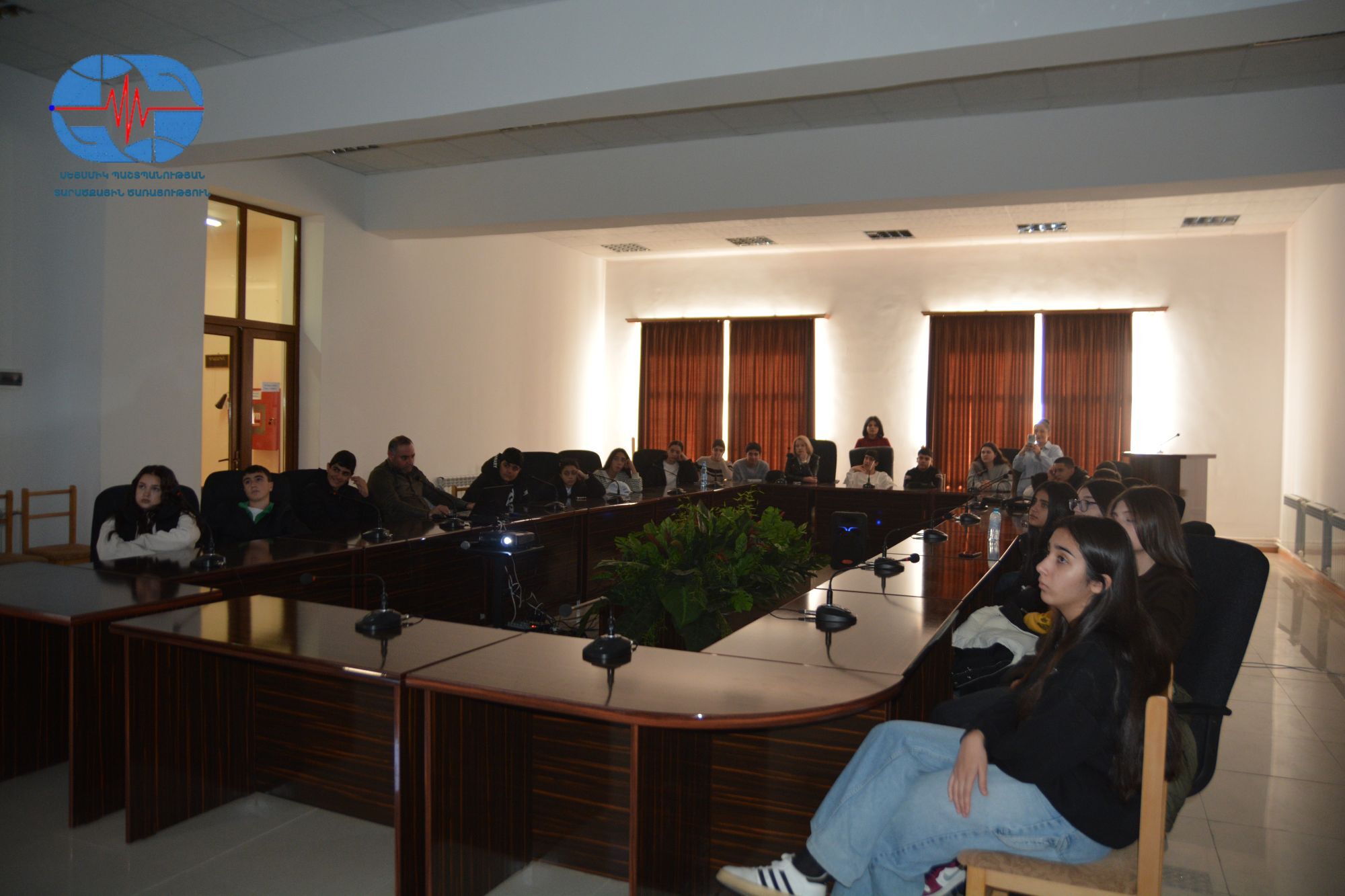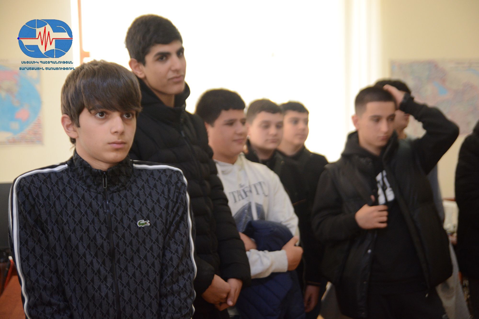 Բնակչության հետ տարվող աշխատանքների վարչության գլխավոր մասնագետ Հայկանուշ Եսայանը ներկայացրեց մեր տարածաշրջանում երկրաշարժերի առաջացման պատճառները, երկրաշարժից պաշտպանվելու վերաբերյալ գիտելիքի կարևորությունը, Սպիտակի երկրաշարժից քաղված դասերը և սեյսմակայուն շինարարության ոլորտում արված փոփոխությունները։ Ցուցադրվեց «Հաշտ ապրել երկրաշարժի հետ» ուսուցողական ֆիլմը։