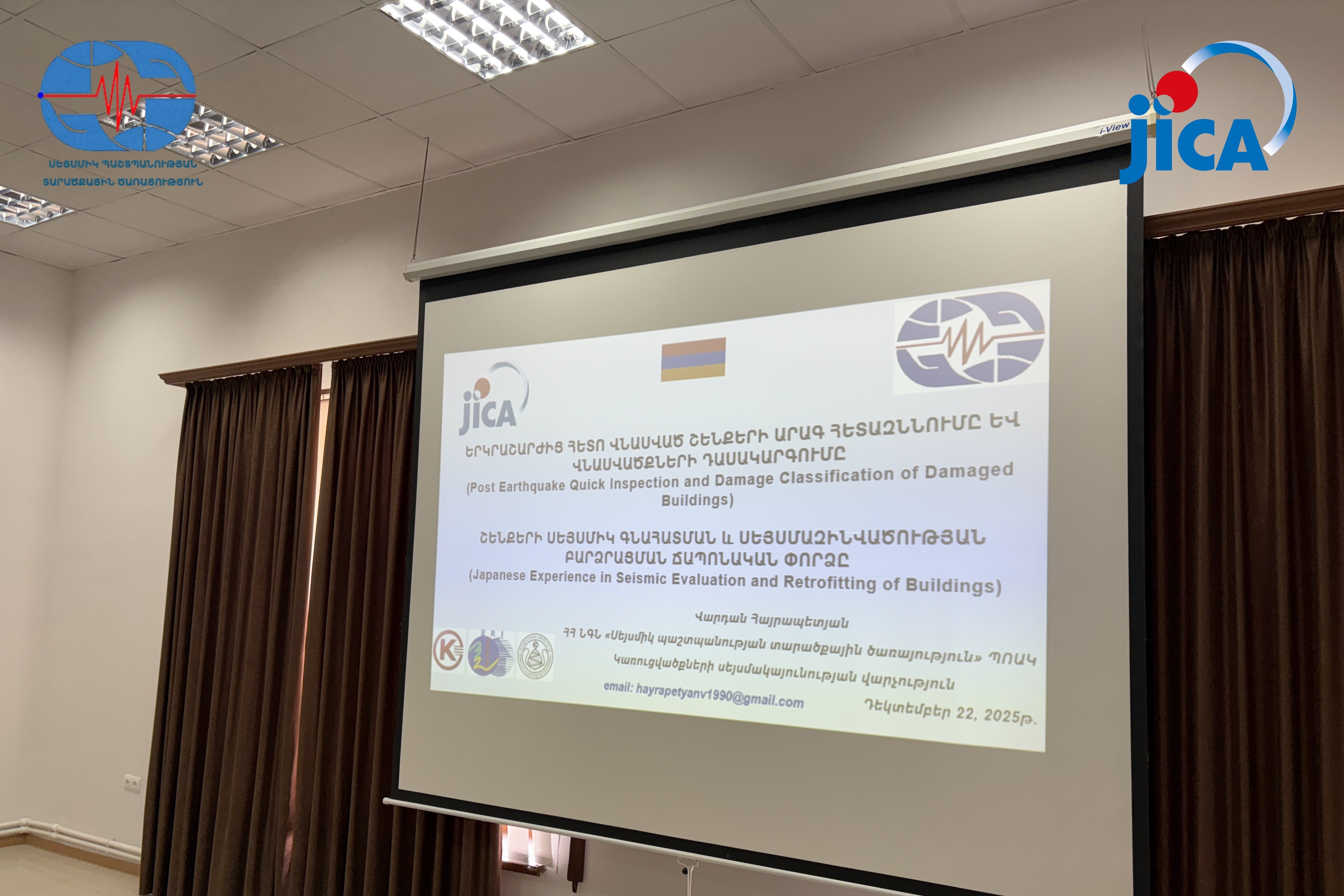 Ճապոնիայի միջազգային համագործակցության գործակալության (JICA)՝ «Երկրաշարժից հետո շենքային պայմանների արագ հետազննության ճապոնական մեթոդները, կառուցվածքների տեխնիկական վիճակի գնահատման և շենքերի սեյսմիկ ուժեղացման ճապոնական փորձը» թեմայով փոքր գրանտային ծրագրի շրջանակում՝ դեկտեմբերի 22-ին անցկացվեց սեմինար-քննարկում ՀՀ ներքին գործերի նախարարության «Սեյսմիկ պաշտպանության տարածքային ծառայության» աշխատակիցների համար: Նպատակն էր ուսումնասիրել սեյսմակայուն շինարարության ոլորտում ճապոնական փորձը և մշակել առաջարկներ։